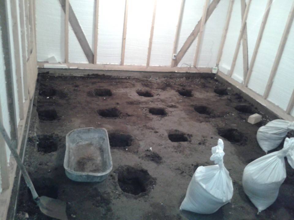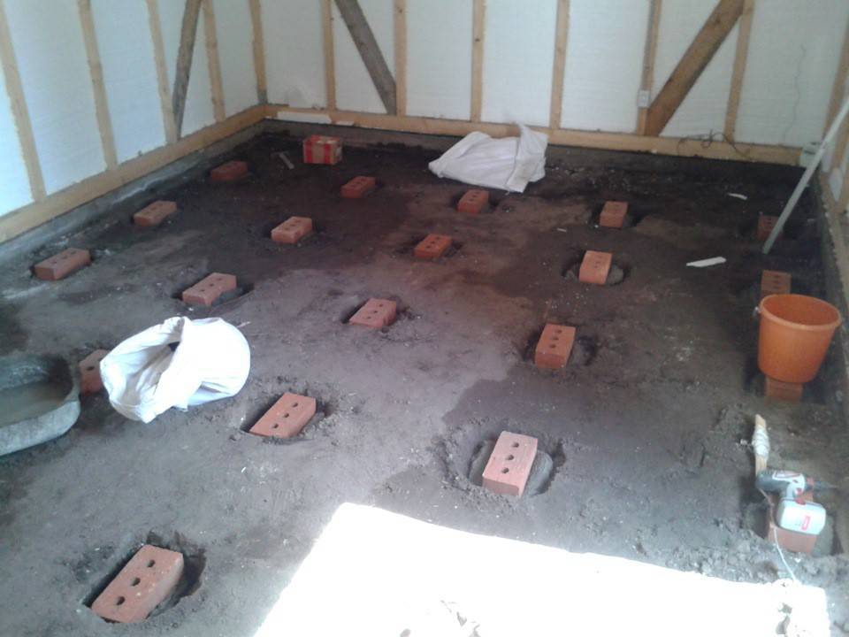 - если влажные стены, то слой глины на пол укладывать не рекомендуется. Как вариант – слой просеянного песка (без глиняных частиц, которые удерживают влагу), а потом можно утрамбовать пол боем красного обожженного кирпича или отработанного шлака;