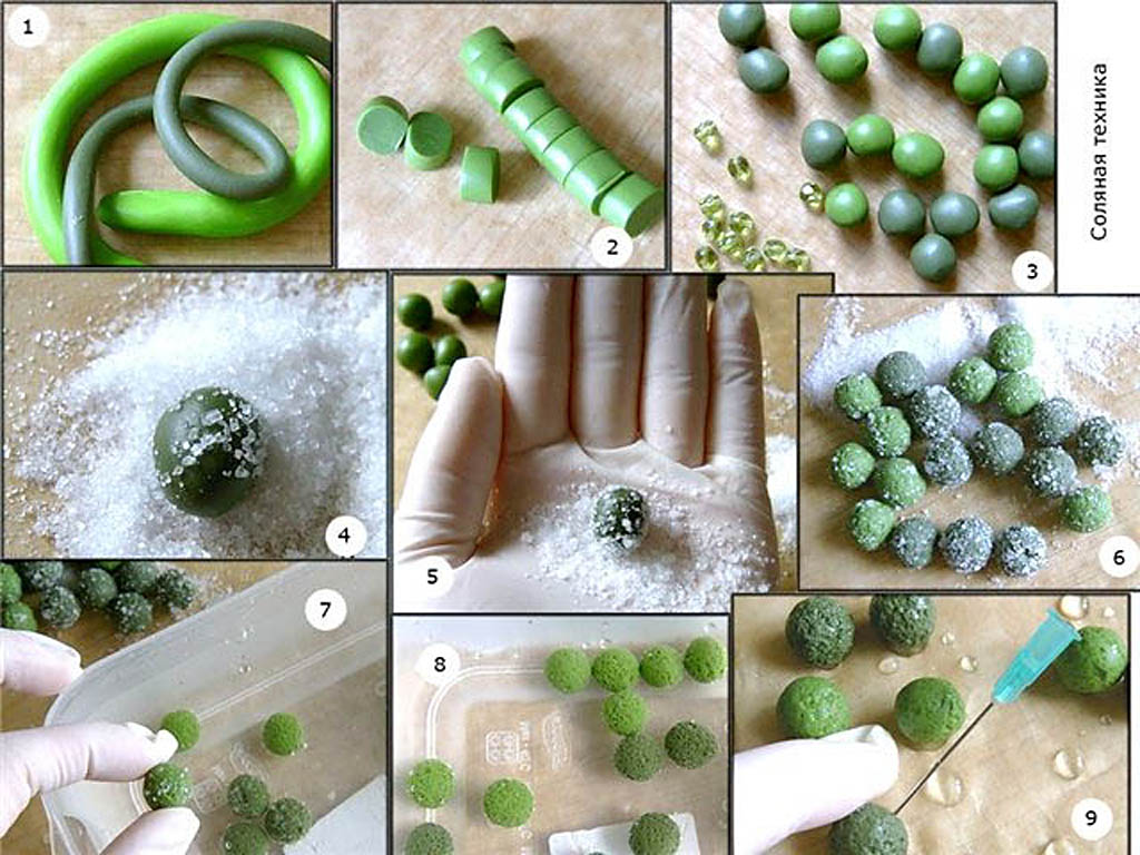 Самодельные бусы из пластики – на рис. Об узорах немного поговорим далее, а пока присмотритесь: в таких дырочках нитка не протрется. Как их проделать? Нужно знать, что скорость высыхания пластики – ок. 2 мм/сутки. Т.е., корочка толщиной 0,25-0,35 мм образуется прим. за 3-4 часа. Корочка такой толщины будет уже достаточно прочной, но еще эластичной. Вот из нее и нужно сформировать кратеры отверстий, а уж затем досушить детали, сколько нужно. Довольно долго; шарик из пластик диаметром 10 см, т.е. радиусом 50 мм, при 20 градусах полностью сохнет 25 суток, чуть ли не месяц.