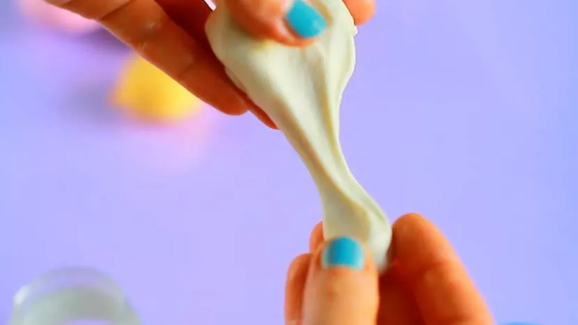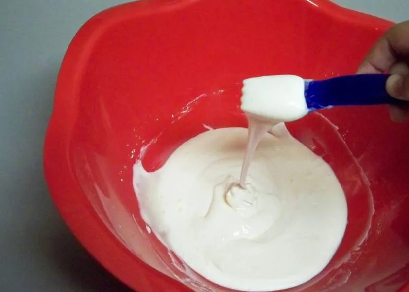 - Затем сразу же набирайте крем в ложку и вводите в клей очень быстро при тщательном перемешивании до тех пор, пока крем с ПВА не станут однородной массой.