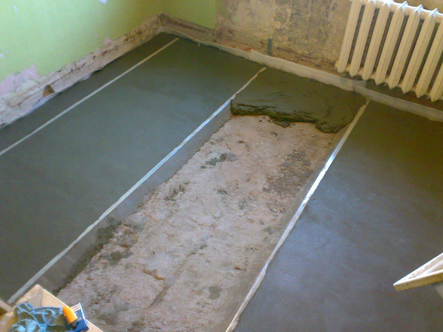 К самому важному этапу приступают после схватывания состава под выравнивающими элементами. С учетом высоких ожидаемых нагрузок нужна марка прочности не ниже М200, не образующая трещин после застывания