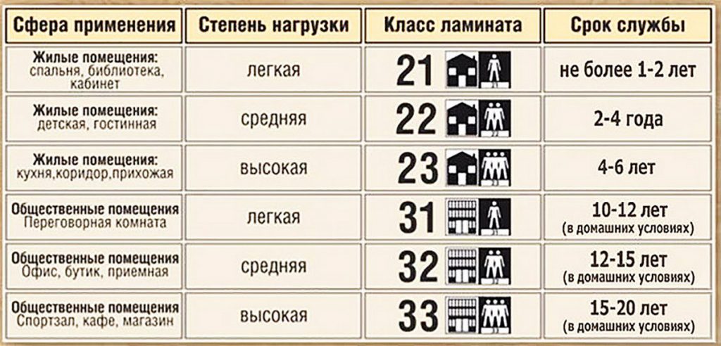 При выборе ламинированного напольного покрытия учитывают назначение помещения. Существуют следующие классы ламината: