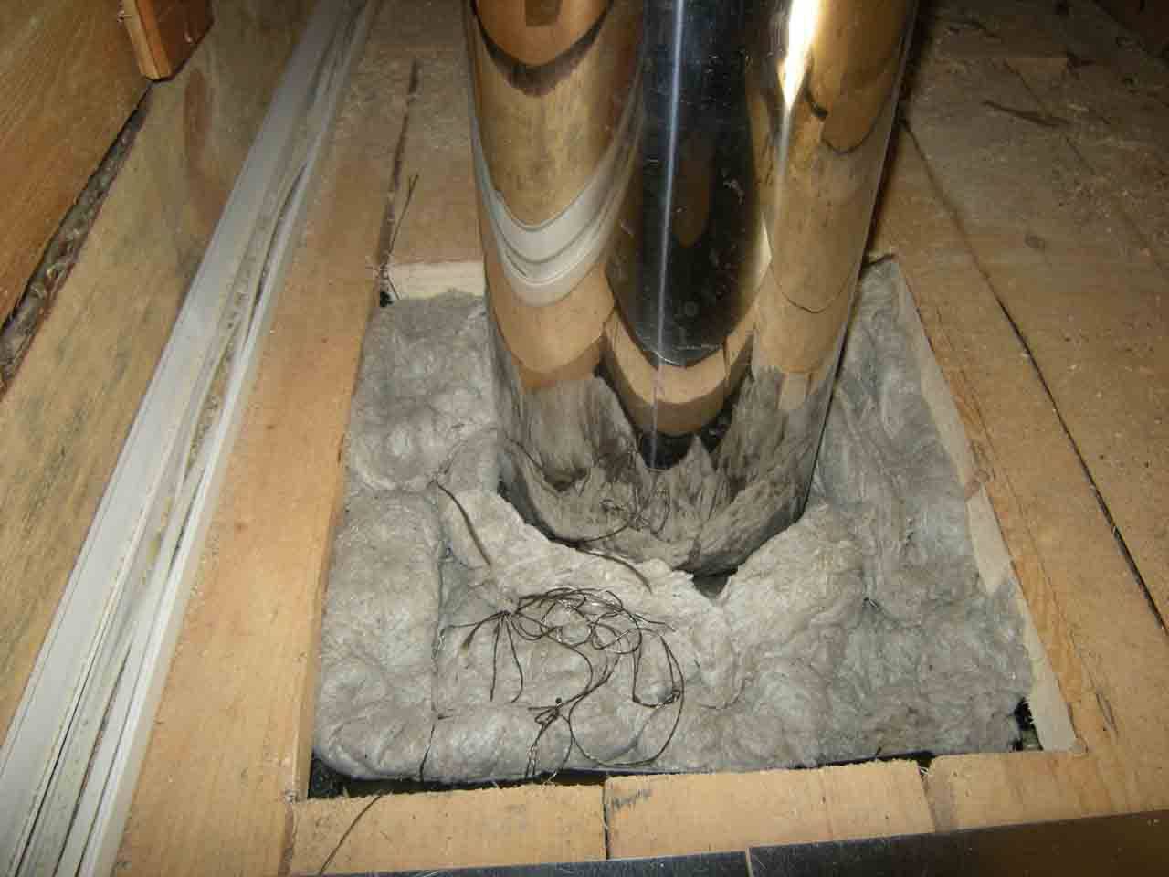 - С помощью асбеста обложить вывод трубы на потолке и через крышу.