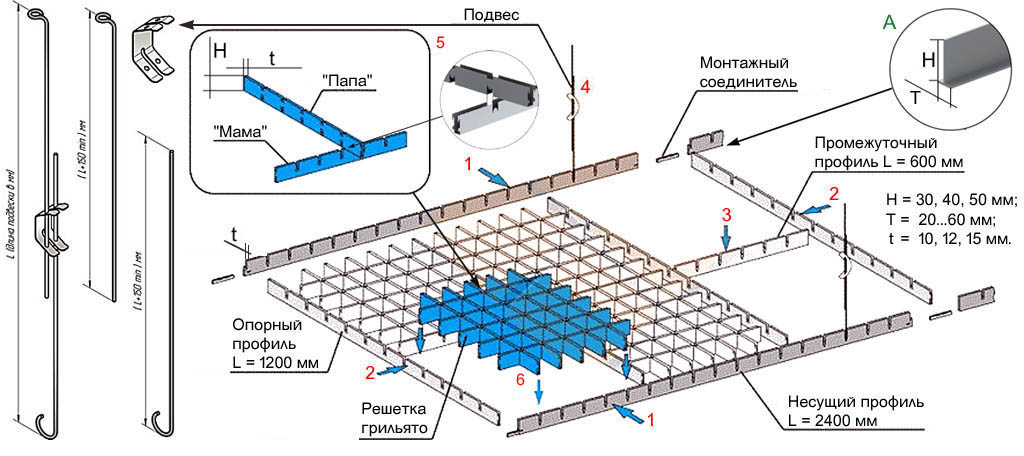 Монтаж подвесного потолка Грильято: схема сборки ячеистой подвесной конструкции