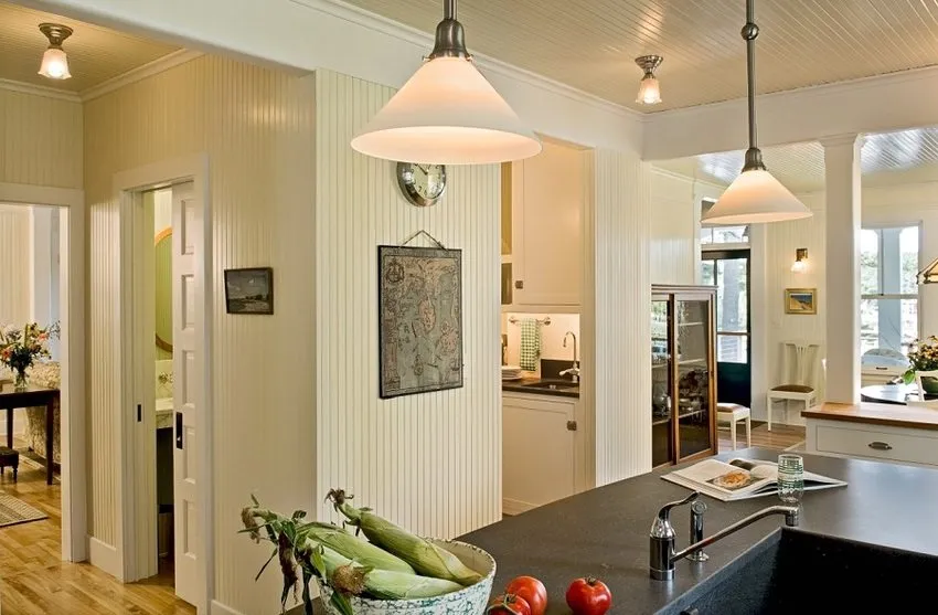 Потолок и стены кухни-гостиной облицованы пластиковой евровагонкой