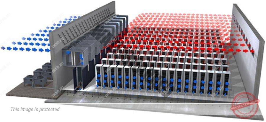 При использовании систем с притоком воздуха (Free Cooling), оборудуется вытяжная вентиляция. Такой способ охлаждения позволяет снизить энергозатраты, если температура на улице меньше той, которую выдает нагретое оборудование. На иллюстрации показан пример со шкафными кондиционерами с внешними блоками.