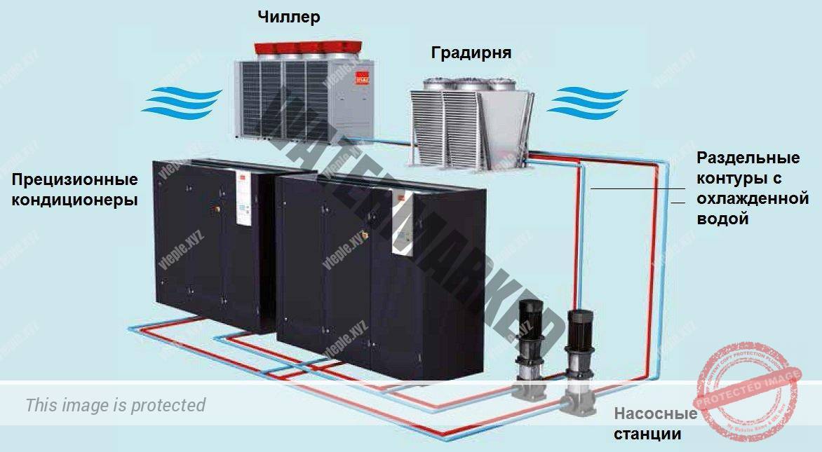 Схема подключения прецизионных кондиционеров к чиллеру и градирне.