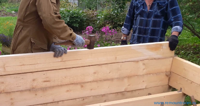 И вот таким аналогичным образом, венец за венцом, поднимаем стены пристройки на нужную высоту. Для плотного прилегания досок друг к другу подбиваем их сверху молотком.
