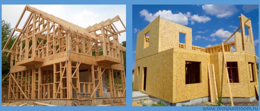Каркасное строительство стен подразумевает возведение по площади и периметру будущей стены продольных, диагональных и поперечных металлических балок или бруса. Наружная и внутренняя поверхность стен обшивается строительными плитами из ДСП или ОСБ.