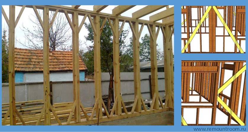 Стены для пристройки можно возводить несколькими способами:- кирпичная кладка;- каркасно-щитовой способ;- древесный венец (доски, брус, бревна).Если использовать каркасно-щитовой способ возведения, то в первую очередь необходимо начать с установки угловых стоек, которые располагаются по углам строения и состоят из треугольных элементов. Причем формируемый треугольник из стоек должен получиться прямоугольным – только таким образом обеспечивается самая жесткая конструкция. Дополнительно усилить крепление стоек можно с помощью стальных скоб. В итоге, полностью смонтированный каркас выглядит, как показано на рисунке.