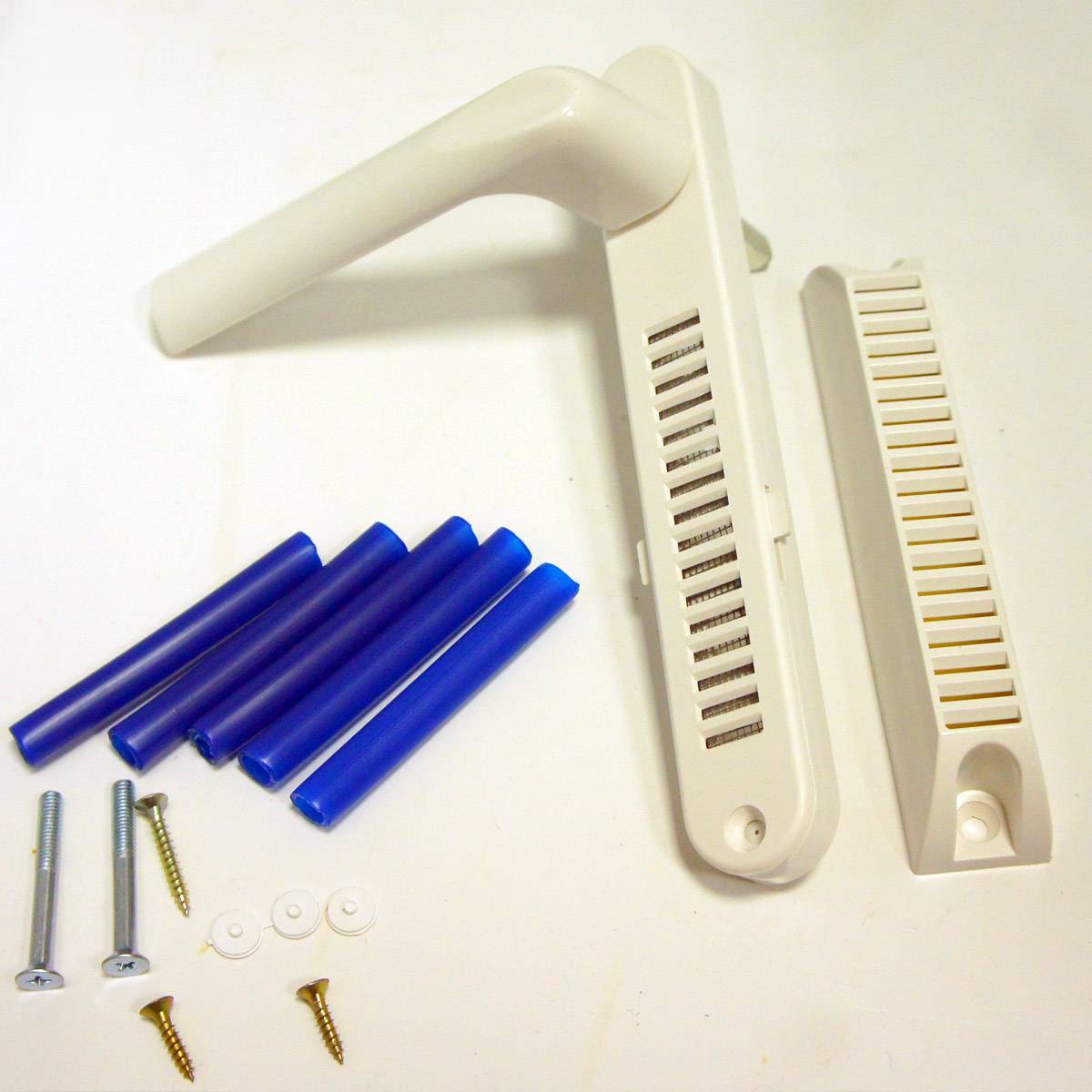 Еще один вид устройств для вентиляции — оконные ручки с приточными клапанами. По сути это те же щелевые, но пропускная способность их гораздо ниже, так как поток идет не через цельную щель в створке, а по трубкам, которые соединяют улицу с помещением.