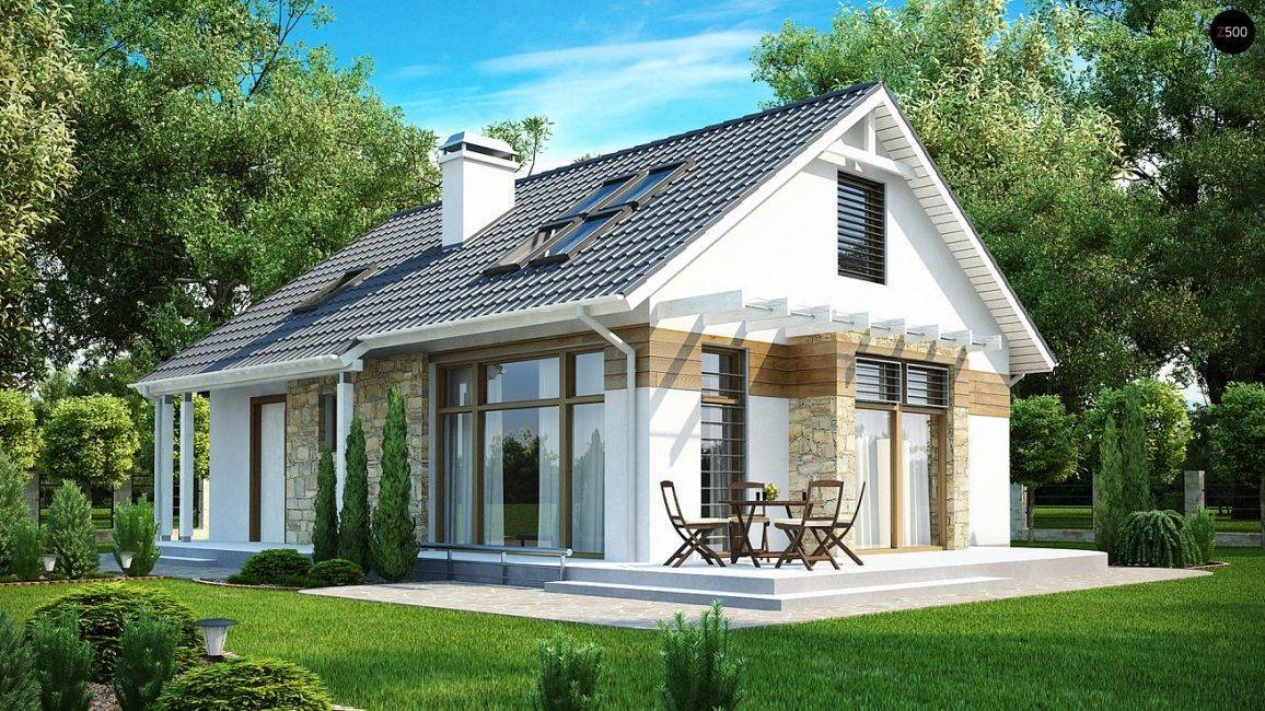 В данном варианте планировки с тыльной стороны дома предполагается просторная терраса. В общую площадь дома она не входит. Интересный дизайн делает дом непохожим на другие: большое окно на полтора этажа, кубической формы гараж и навес перед домом — не слишком влияют на ценник, но делают дом уникальным.
