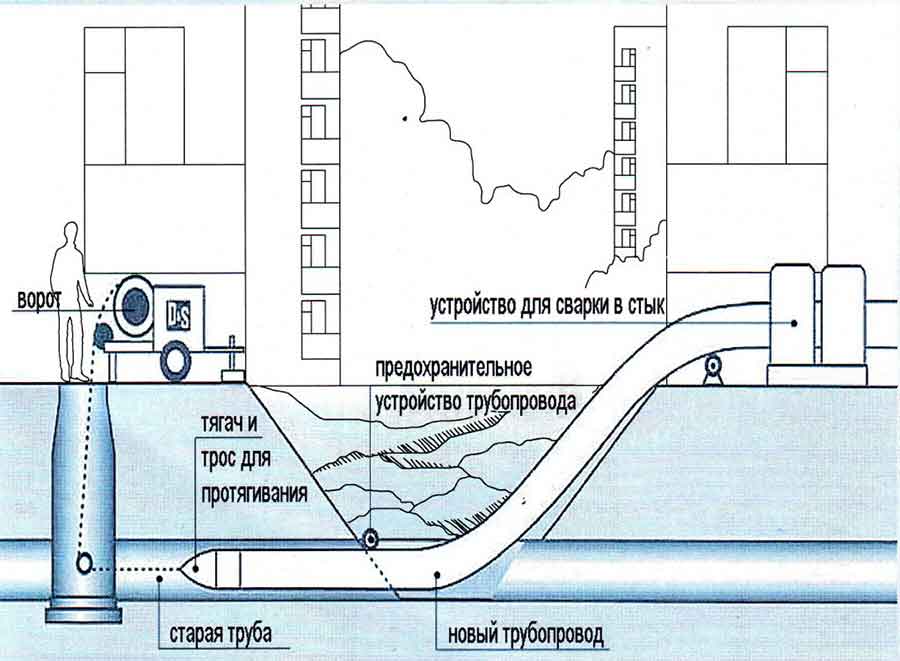 Метод, при котором происходит разрушение старого трубопровода, после чего протягивается новая труба, будет очень полезен в той ситуации, если релайнинг не позволит создать необходимого напора при реставрации трубопровода. Данный метод хорошо подходит для проведения работ в тяжелых гидрогеологических условиях, а также при нахождении вблизи ремонтируемого трубопровода иных коммуникаций или построек.