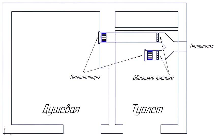 Вентиляция санузла может иметь собственный вытяжной канал — тогда все легко, просто и понятно. Перед входом в вентканал ставим обратный клапан для перекрывания потока воздуха, который будет двигаться в помещение. Но далеко не все квартиры могут похвастаться индивидуальными шахтами для ванной и туалета. В некоторых домах старой планировки, вытяжной канал есть только в туалете. Вентиляцию ванной делают проведя короб через стену. В этом случае обратный клапан на вентиляцию ставим не только на выход в вентканал, но и в канале между ванной и туалетом. Это предотвратит попадание неприятных запахов в ванную.