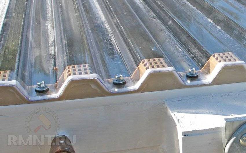 Крепление поверх стропил соединительных и торцевых профилей. Они продаются в тех же точках реализации, что и поликарбонатные листы. Подбор размеров профиля осуществляется с ориентиром на толщину и габариты поликарбоната.