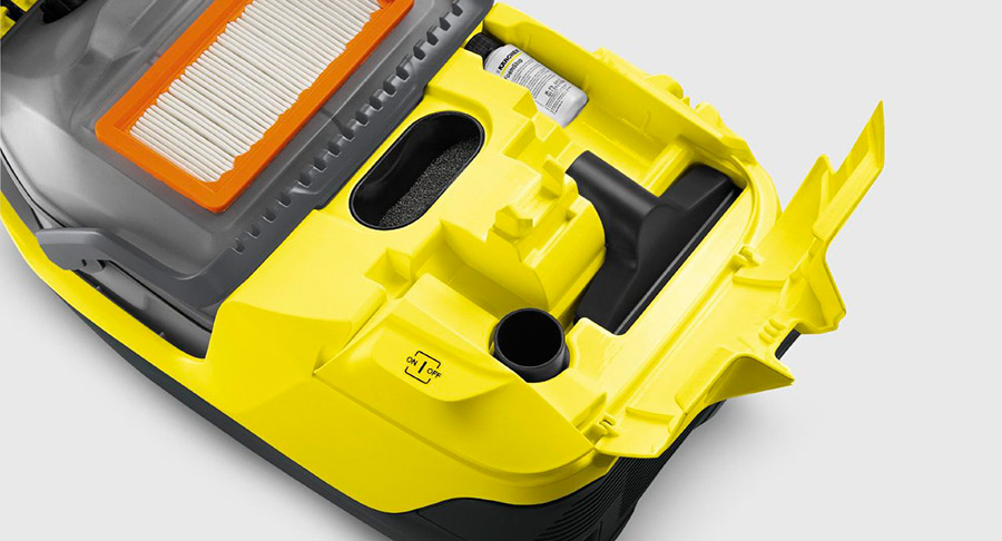 - Фильтр. Чистота всасываемого воздуха определяется степенью его фильтрации, а от нее зависит состояние среды в помещении и долговечность пылесоса. В аппаратах Керхер используются фильтры сухой очистки (грубой для защиты двигателя и тонкой, в т.ч. типа НЕРА) и аквафильтры, в которых пыль осаждается в резервуаре с водой.