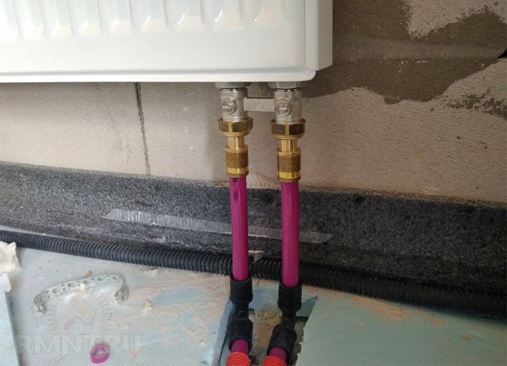 На момент монтажа разводки должно быть точно известно положение установки радиаторов. Высота может варьироваться, но горизонтальное смещение, как правило, недопустимо. Связано это с тем, что поворотный фитинг не находится на поверхности, то есть над покрытием выступает лишь прямой участок, присоединяемый к отводу радиатора. От этого правила можно отступать, только если используются узлы нижнего бокового подключения, в таком случае выводы труб располагают на расстоянии около 100–120 мм от торца футорки радиатора.