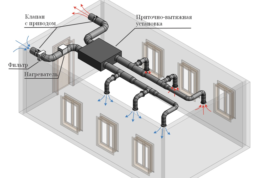 Агрегаты устанавливают в середине канала вентиляции, имеющий круглое или прямоугольное сечение. Воздух, поступающий с улицы, пропускается сквозь систему фильтрации и попадает в калорифер для приточной вентиляции, где происходит его нагрев за счет тепла, который отдает водяная отопительная система, поступающая к теплообменнику через канал воздухонагревателя.