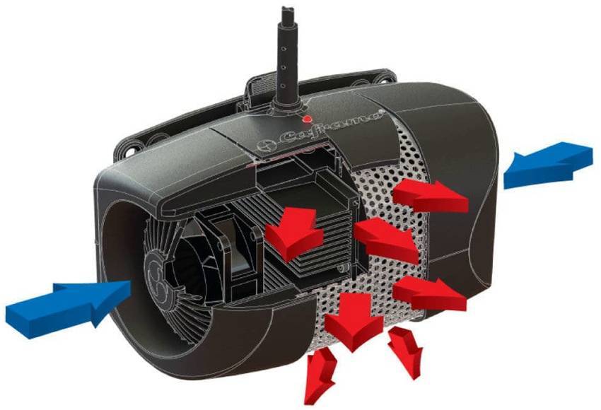 - для равномерного распределения нагретого воздуха по помещению в приборе стоит вентилятор (он же отвечает за обратную подачу воздушных масс в калорифер).