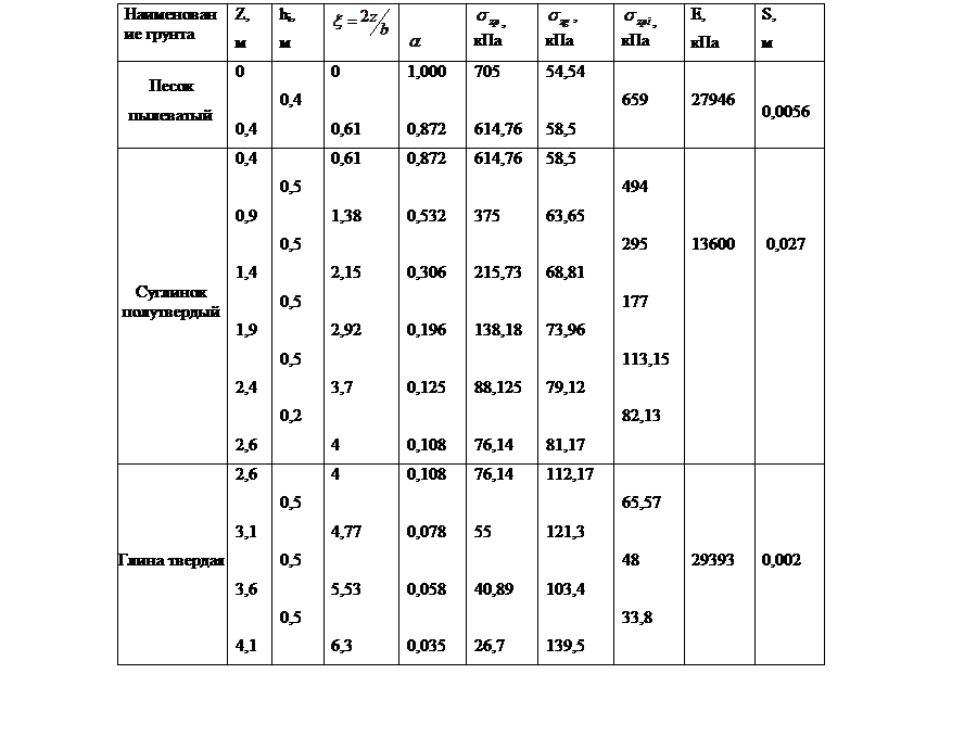 Осадку определяем до тех пор, пока , т.е. напряжения от внешней нагрузки не должны превышать 20% напряжений от собственного веса грунта.