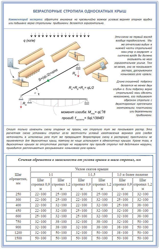 Мало знать, как построить односкатную крышу своими руками поэтапно – важно не допустить возникновение эксплуатационных проблем и при этом желательно не переплатить за материалы с избыточным запасом прочности. Такую задачу вполне по силам решить с помощью методики расчета сечения стропильных ног и расстояния между ними