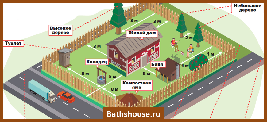 Расстояние от границы участка (забора) до бани определяется типом системы водоотведения: