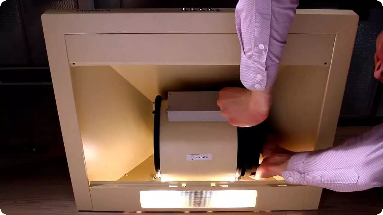 Монтаж вытяжки, прикрепленной к днищу шкафа