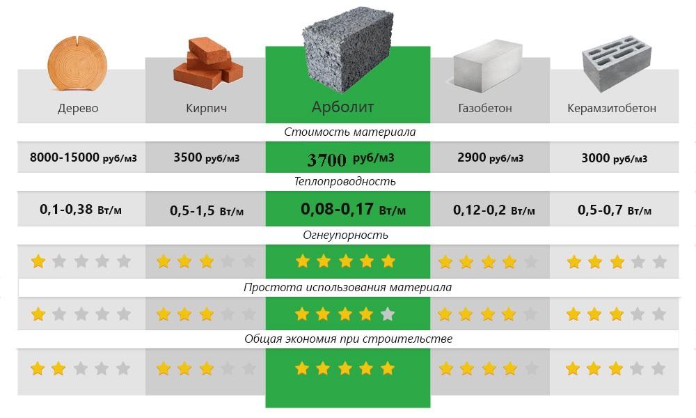 Если сравнивать арболитовые блоки с другими строительными материалами, то все преимущества и недостатки становятся более явными. Некоторые параметры указаны в таблице: