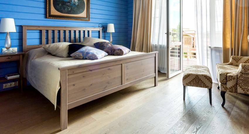 Из-за низкой теплопроводности каркас из массива не остывает. Человек психологически воспринимает дерево живым, поэтому детали из материала создают ощущение комфорта в спальне. Красивый натуральный рисунок подчеркивают при помощи лака, морения или полировки. К недостаткам относят: