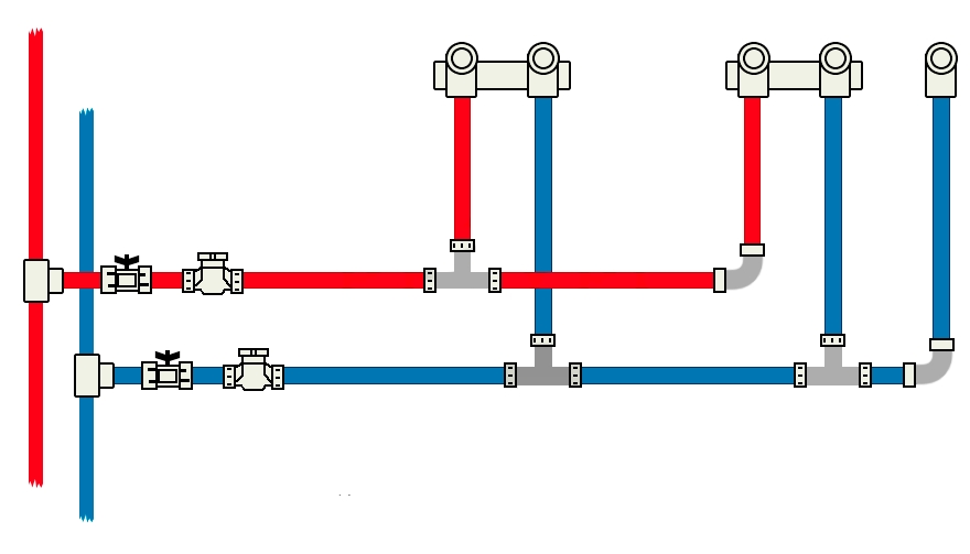 Для межэтажных стояков используют трубы с наружным диаметром не менее 20-ти мм, для этажной разводки — с диаметром 16 мм и 14 мм. Лучше использовать как можно меньше разборных соединений. Нужно чтобы все соединительные элементы отвечали типу (серии) труб и также как арматура и ревизия, находились в доступных местах.