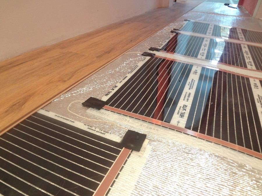 Теплый пол на основе инфракрасных нагревательных элементов выполняется иначе. В случае укладки ламината пленку стелют непосредственно под него.