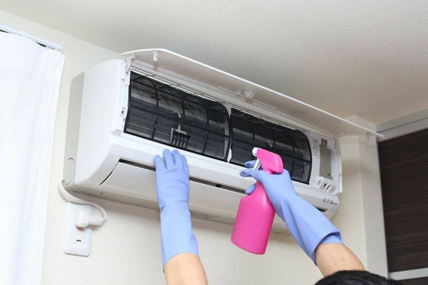 Для распределения по поверхности применяют пульверизатор, либо обычную тряпку. Главное – чтобы средство не попало в электронную схему или туда, где много проводов. Остаётся подождать, пока устройство просохнет. Потом сплит системы проверяют.