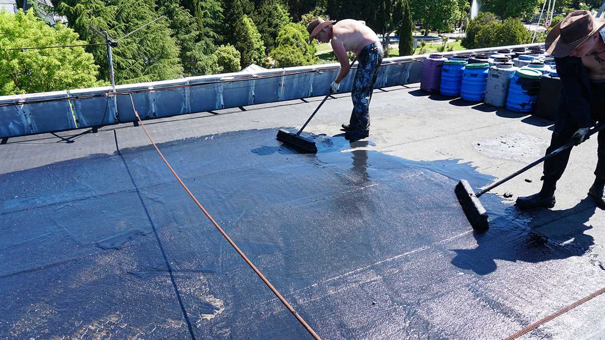 - При полной замене кровельного материала потребуется очистка всей поверхности крыши от старого настила, а также мусора. В итоге должна получиться чистая железобетонная плита. Битум расплавляют в емкости с подогревом до жидкого состояния. Изначально следует тщательно «проконопатить» составом стыки плит, после чего горячий битум наносится на всю поверхность несколькими слоями.