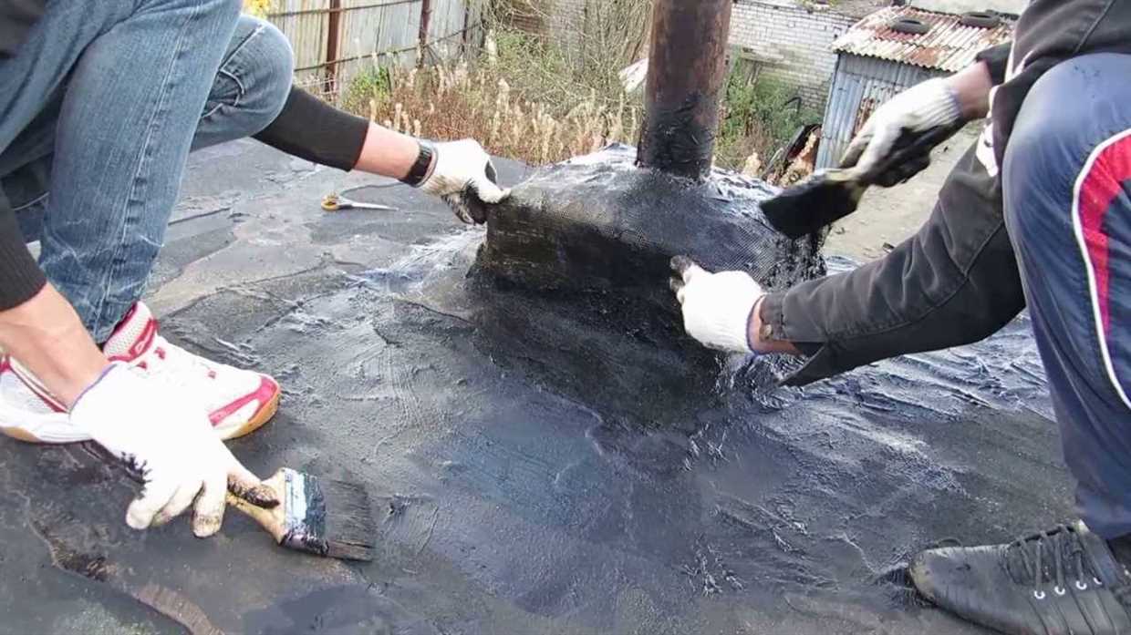 Участки, прилегающие к дымарям и вентиляционным трубам, предварительно изолируются отдельно, слоями материала, причем дымоходы негорючим и термостойким полотном. После чего их сверху накрывают рубероидом и заливают битумом.
