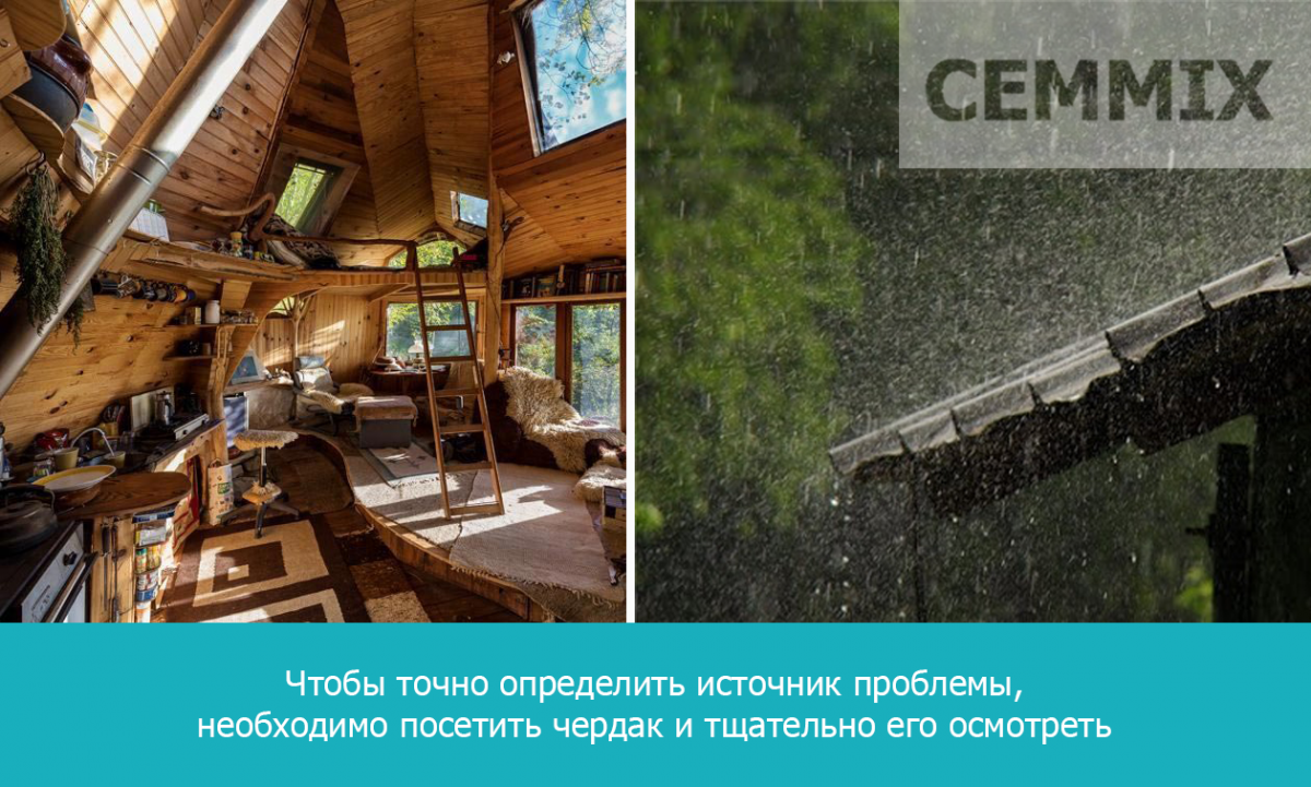 Поэтому, чтобы точно определить источник проблемы, необходимо посетить чердак и тщательно его осмотреть, проверить состояние стропил, гидроизоляции, пола, посмотреть, нет ли сырости и плесени. Еще лучше сделать это во время сильного дождя: тогда вы точно обнаружите место протечки.