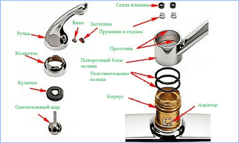 Строение однорычажного смесителя с шаровым механизмом смешения воды
