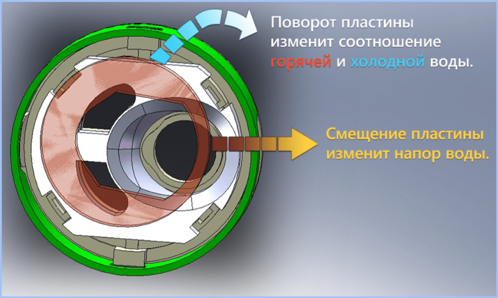 Главными узлами картриджа являются две керамические пластины с прорезями, плотно прилегающие друг к другу. При вращении одной из них вокруг своей оси входные отверстия, через которое поступает холодная и горячая вода, перекрываются в разной степени – таким образом, осуществляется регулировка температурного режима.