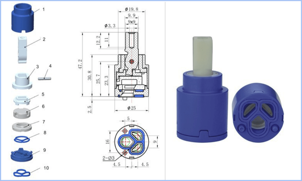 Керамический картридж представляет собой сборное соединение из деталей, установленных в пластмассовый цилиндрический корпус, вверху которого установлен рычаг, на который крепится поворотная ручка. В его нижней части расположены три отверстия: в два из них поступает вода, а из третьего смешанная жидкость направляется в отлив и вытекает наружу.