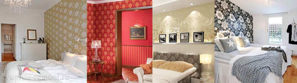 В пространстве разделение психофизиологических функций достигается зрительным разделением на зоны. В этом отношении лучший материал для спальни – текстильные обои, см. рис. Они бывают х/б и велюровые. Последние позволяют получить сильный эффект, но дороже и требуют регулярного ухода.