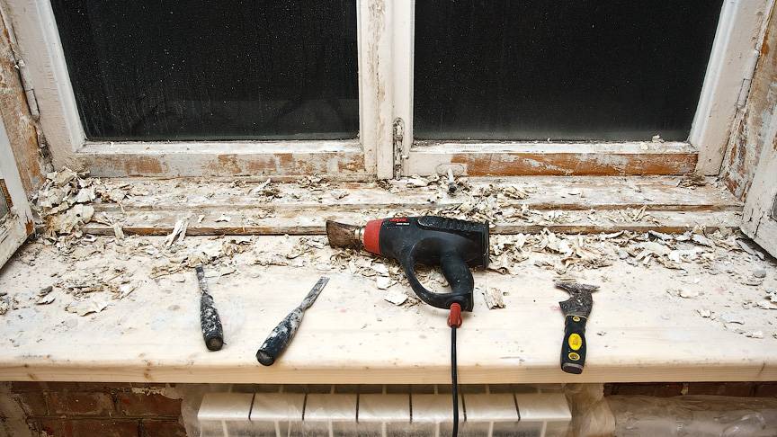 Также стоит учитывать, что простым подручным материалом не обойтись. Потребуется строительный фен, шлифовальная машина, дрель, специальные приспособления для бережного снятия краски, шпатели, уплотнители, фурнитура на замену. Чтобы браться за такую работу самостоятельно нужно обладать специальными навыками, а если их нет – лучше доверить реставрацию окон специалистам.