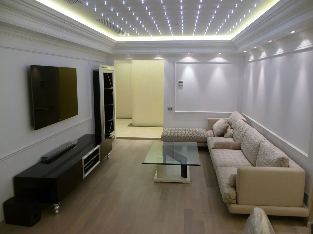 - в зале используют точечные светильники, которые лучше расположить по периметру потолка. Их цвет должен совпадать с интерьером комнаты;