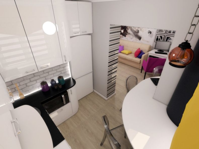 Зал является центральным местом, где собирается вся семья, там же проводятся праздничные застолья, так как кухня не позволяет пригласить гостей. Визуально увеличить пространство помогут светлые оттенки в интерьере.