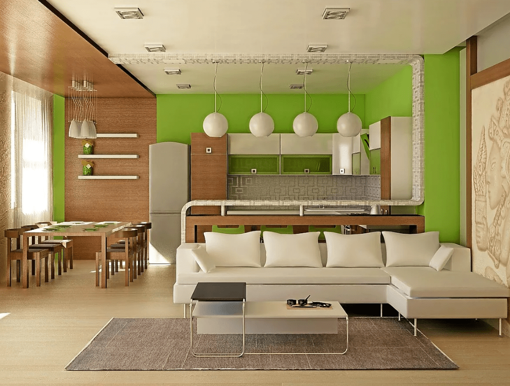 - Использование качественных материалов в гостиной для отделки. Поскольку кухня располагается в непосредственной близости, нагрузка на финишное покрытие будет намного больше. Соответственно, нет такой же свободы в выборе материалов для отделки, как если работать только с гостиной, не объединенной с кухней.