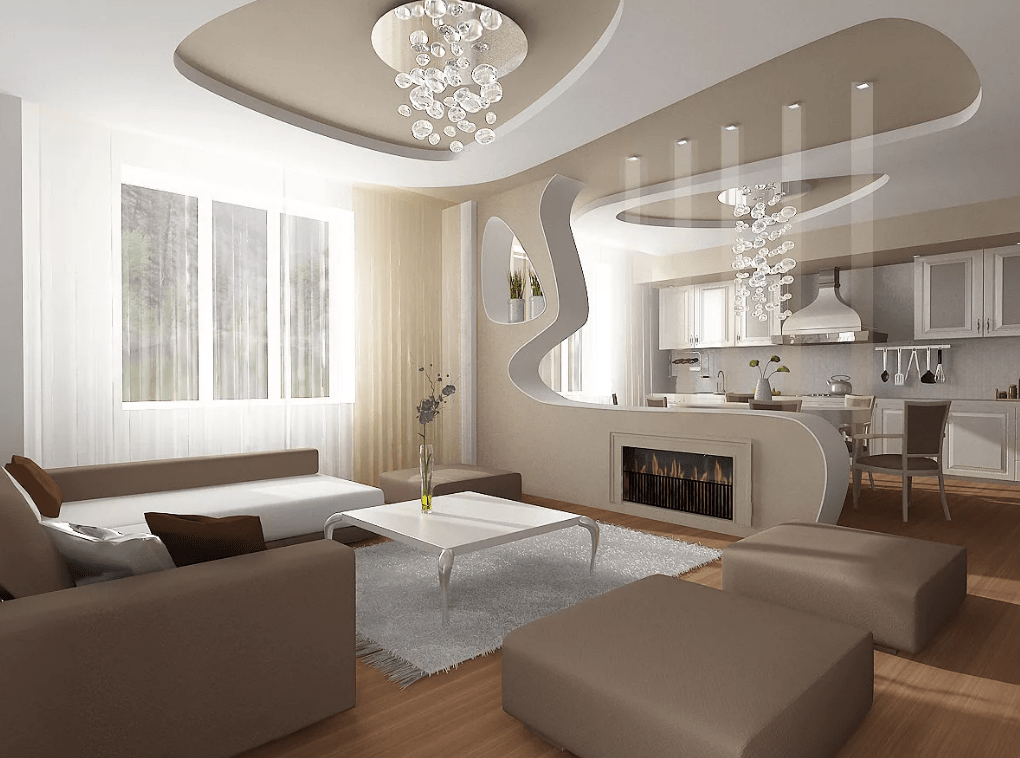 Потолок зала должен гармонировать по цвету и фактуре с общим дизайном комнаты