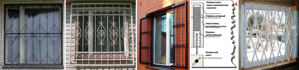 Как упомянуто выше, оконные решетки бывают вставными несъемными (поз. 1 на рис.), накладными съемными, поз. 2, распашными (поз. 3) и раздвижными, поз. 5. В конкретных обстоятельствах оптимальной может оказаться любая их этих конструкций.