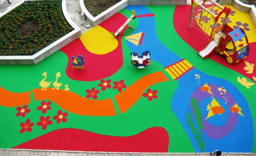 Резиновое покрытие с ярким пигментом хорошо сочетается с детскими игровыми комплексами. При желании, на поверхности площадки можно изобразить фигурные линии и разнообразные рисунки в детской тематике.