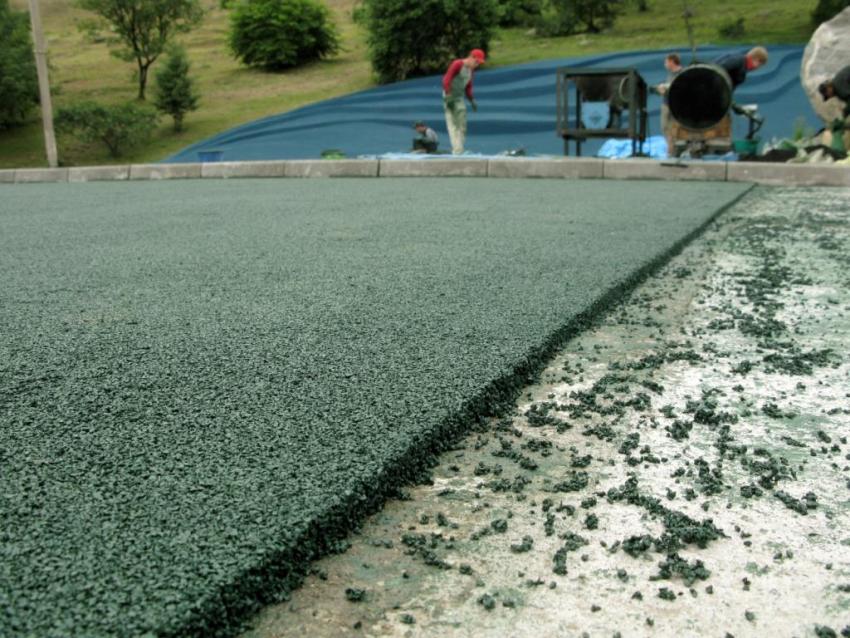 Такой своеобразный резиновый асфальт состоит из резиновой крошки, окрашенной стойким пигментом. Самые популярные цвета — синий, красный и зелёный.