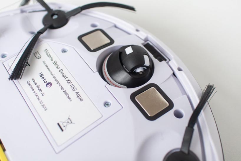 Две боковые щетки – это еще один плюс новой конструкции. Они позволяют более эффективно заметать мусор, исключая его разбрасывание. В остальном, конструкция iBoto Aqua V710 вполне типична. Она включает два мотор-колеса с изменяемой высотой просвета, позволяющие преодолевать препятствия высотой до 15 мм, фронтальное колесо, выполняющее не только функцию опоры, но и позволяющее определить двигается робот или нет, а также три ИК- датчика, не позволяющих роботу упасть при перепадах высоты. Здесь же имеются две контактные площадки для зарядки аккумулятора.