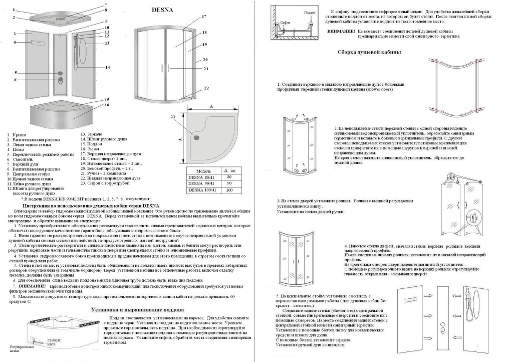 Убедитесь, что стеклянные панели установлены правильно, в противном случае душевая кабина не будет водонепроницаемой. Будьте внимательны и осторожны, если хотите получить профессиональный результат.