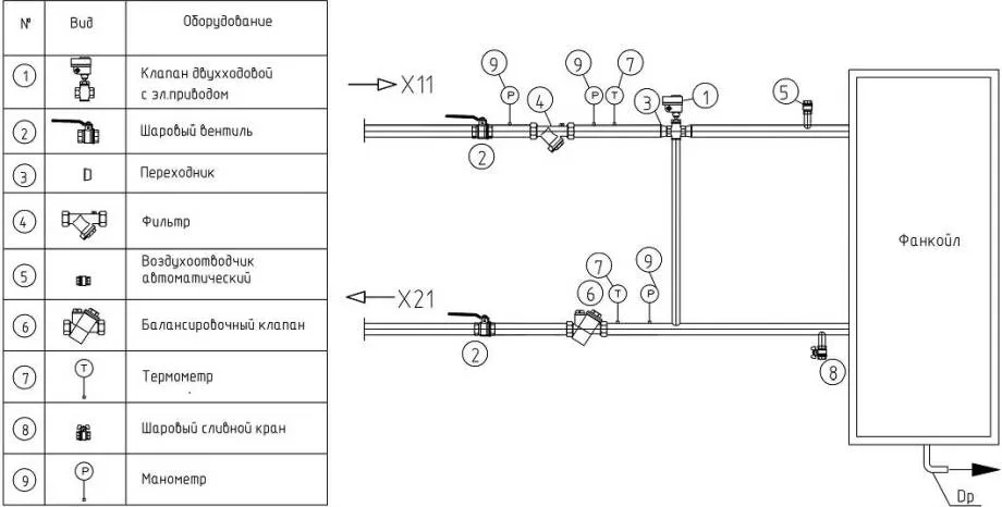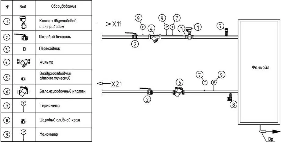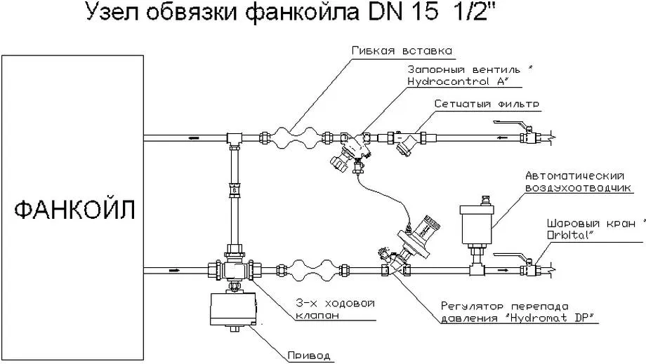 Многие системы фанкойлов устанавливаются при помощи подобной двухтрубной схемы обвязки: