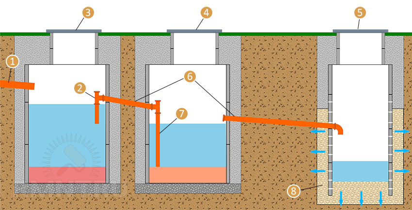 Конструктивно септик может представлять собой даже один протяженный резервуар, однако практичнее разделять зоны по отдельным резервуарам. Потому выкладываются из бетонных колец две-три шахты, соединенных между собой трубами. Первый колодец используется для сбора стоков. В нем проходит первая стадия разделения, вторая фаза анаэробного разложения и частично третья. Во втором резервуаре накапливается уже отстоянная вода частично очищенная и обеззараженная, после чего поступает в грунт через фильтрующий слой и дренажную систему.